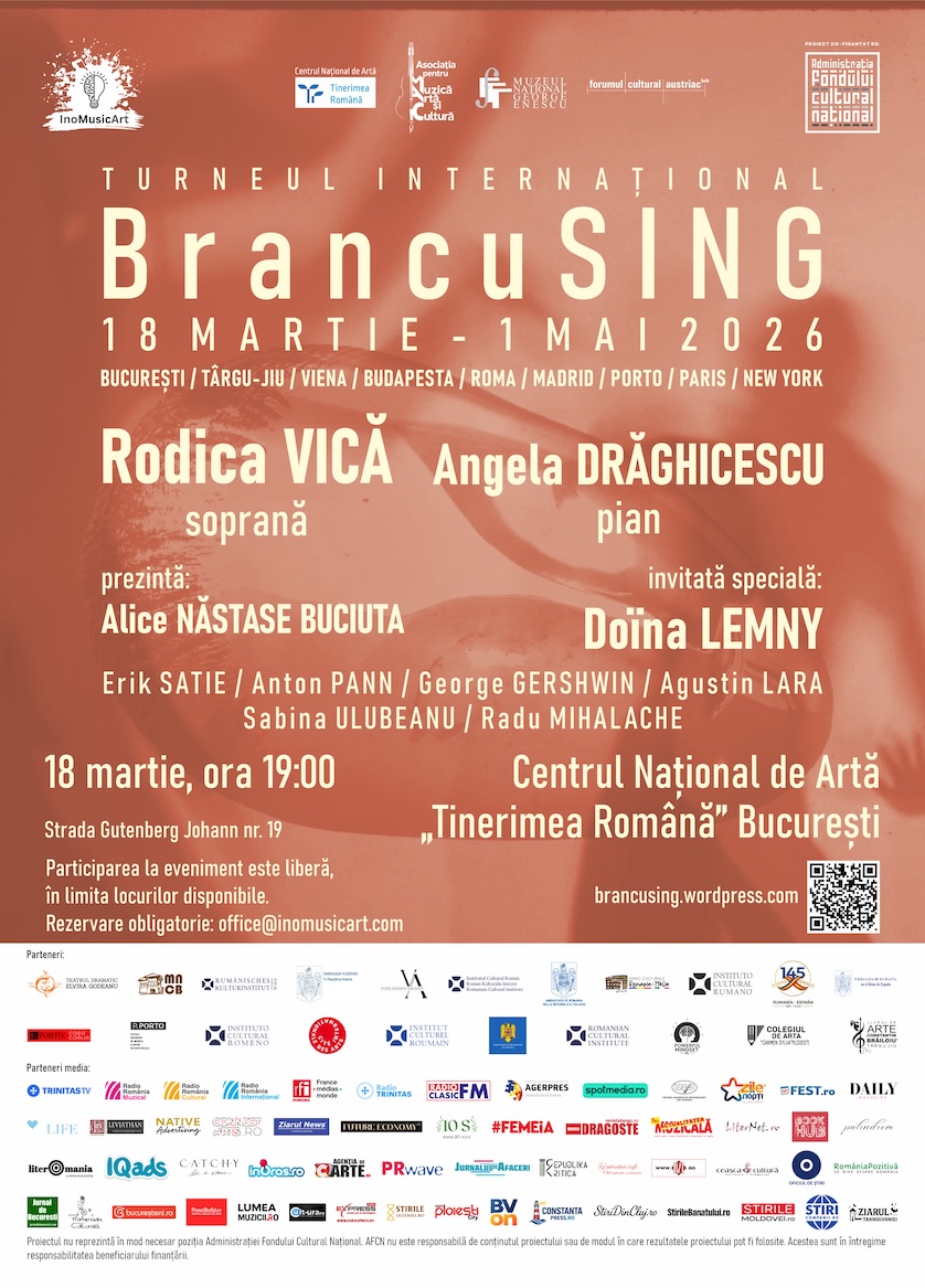 Miercuri, 18 martie 2026, ora 19:00, la Centrul Național de Artă „Tinerimea Română” din București (Strada Gutenberg Johann nr. 19, Sector 5), Asociația InoMusicArt, cu sprijinul AFCN – Administrația Fondului Cultural Național și în parteneriat cu Centrul Național de Artă „Tinerimea Română”, Asociația pentru Muzică, Artă și Cultură, Muzeul Național „George Enescu” și Forumul Cultural Austriac, organizează concertul de deschidere a Turneului internațional BrancuSING, turneu ce marchează împlinirea a 150 de ani de la nașterea lui Constantin Brâncuși printr-un demers artistic care transpune în limbaj sonor ideile și formele sculpturale ale marelui artist, dar și o întâlnire între muzică, patrimoniu, istoria artei și creația contemporană.