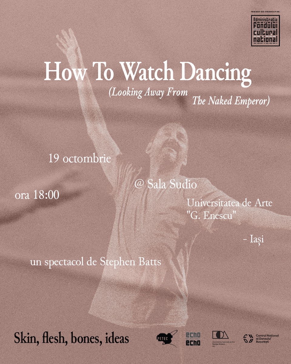 Pe 19 octombrie 2025, de la ora 18:00, la Sala Studio a Universității Naționale de Arte „George Enescu” din Iași, publicul este invitat la spectacolul „How To Watch Dancing (Looking Away From The Naked Emperor)”, creat și interpretat de Steve Batts, coregraf, dansator și director artistic al companiei Echo Echo Dance Theatre Company din Derry-Londonderry, Irlanda de Nord. Intrarea este liberă, în limita locurilor disponibile, pe bază de rezervare prin formularul online: https://forms.gle/pR2K5pDeAXVbRAkf9.