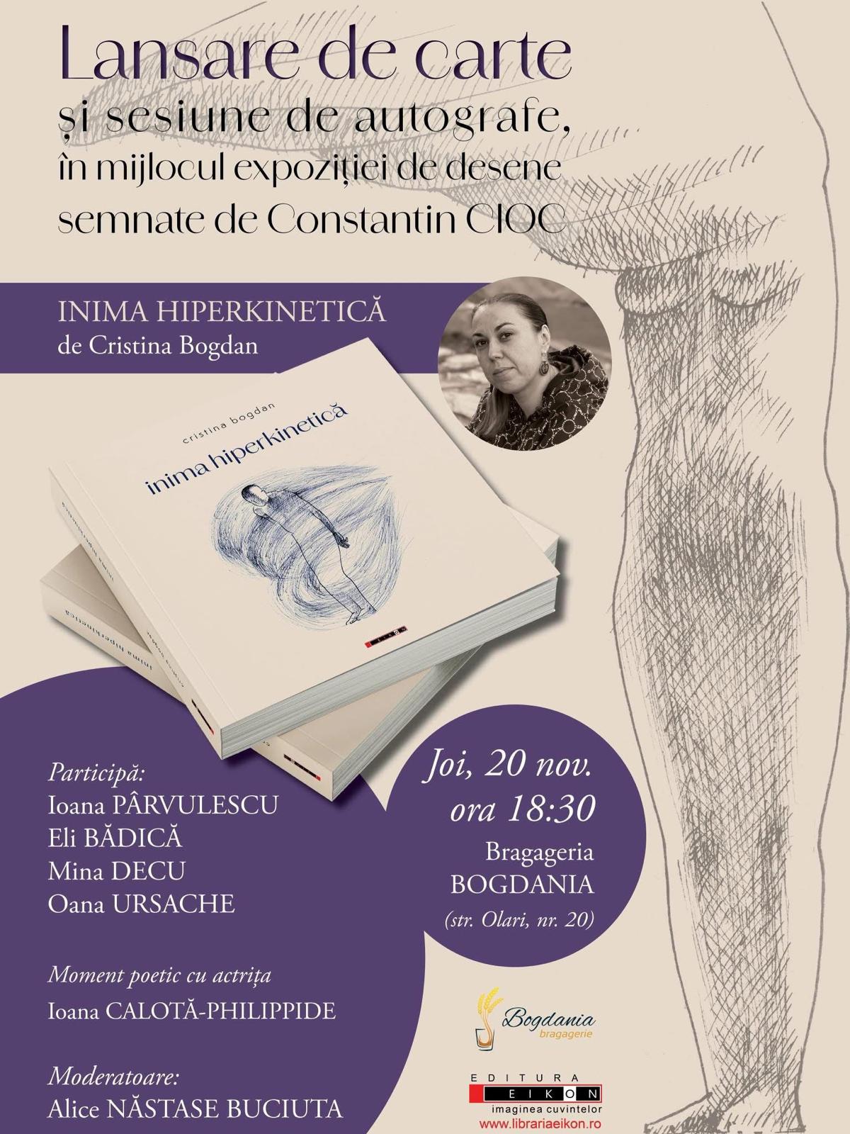 Volumul inima hiperkinetică (apărut recent la Editura EIKON), debutul în poezie al Cristinei Bogdan, antropolog și conferențiar universitar la Literele bucureștene, și-a început turneul de promovare la Galați – unde a avut loc un eveniment de lansare în Casa Cuza Vodă, pe 13 noiembrie 2025 – și la Brăila, unde a fost prezentat în cadrul Cenaclului literar Beyond Words, în Sala Pro Arte a Centrului Județean pentru Conservarea și Promovarea Culturii Tradiționale Brăila, în ziua de 14 noiembrie.