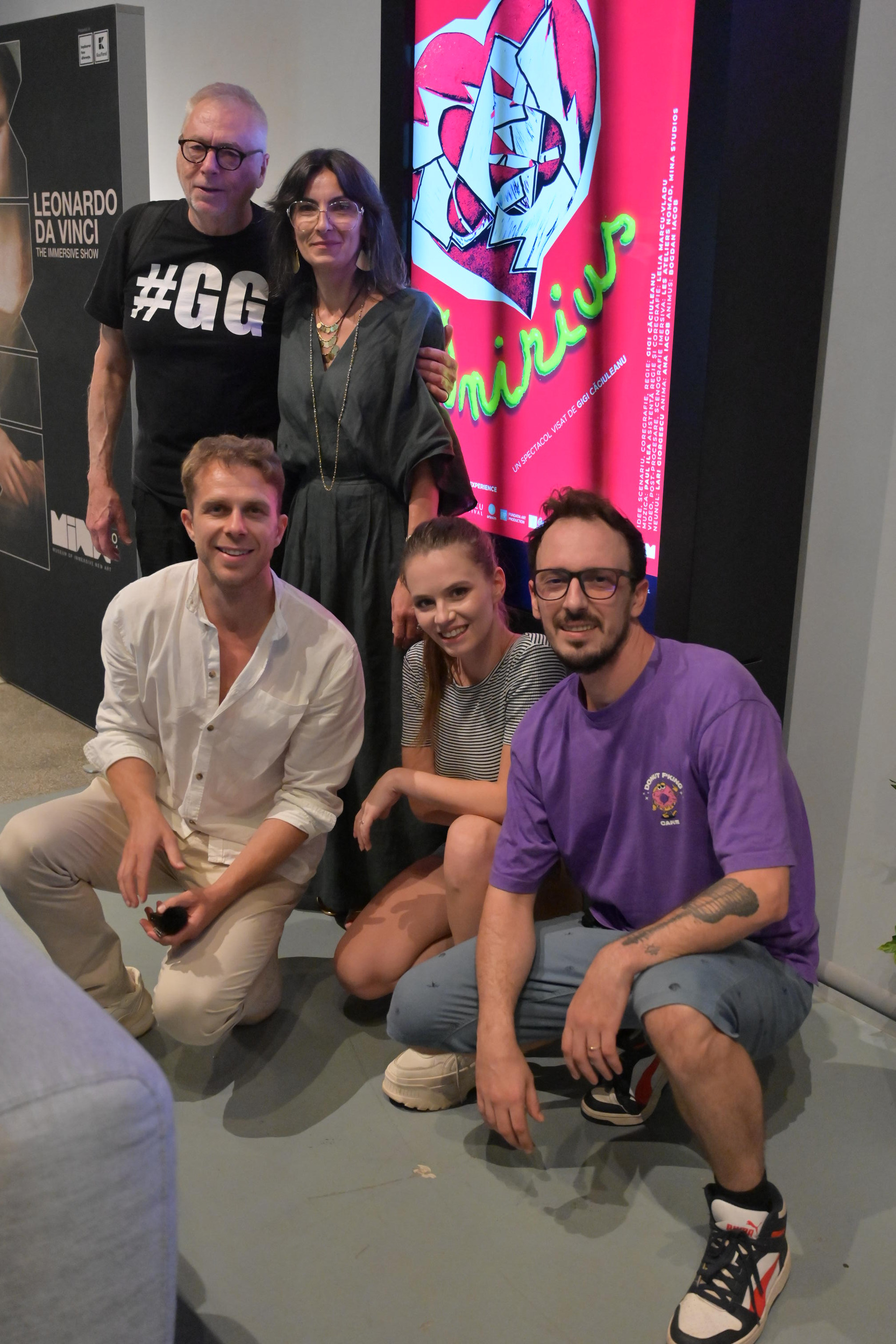 L.G.: Foarte greu, nici nu-ți imaginezi. Îmi venea să le zic oamenilor: știți, eu pot să fac lucruri și acum, în fața dumneavoastră! Aproape că mi-a fost greu să mă țin în frâu, dar bineînțeles că m-am ținut, fiindcă, totuși, ne controlăm. Trebuie să-i mulțumesc lui Gigi pentru că mi se pare – și o să folosesc un jargon – mi se pare că n-are toate țiglele pe-acoperiș, în cel mai bun mod cu putință, după cum vedeți e un artist care se reinventează și care ține pasul cu vremurile în care suntem si reușește sa facă artă aproape din orice. E un spirit neliniștit și un căutător și mi se pare ca spectacolul ăsta, pe lângă ce am văzut în prim plan, a fost și o expoziție de desene personale. Poate mai puțină lume știe că, pe lângă faptul că Gigi scrie poezie el și desenează foarte mult, toate desene sunt făcute de Gigi și cred că și asta trebuie menționat.