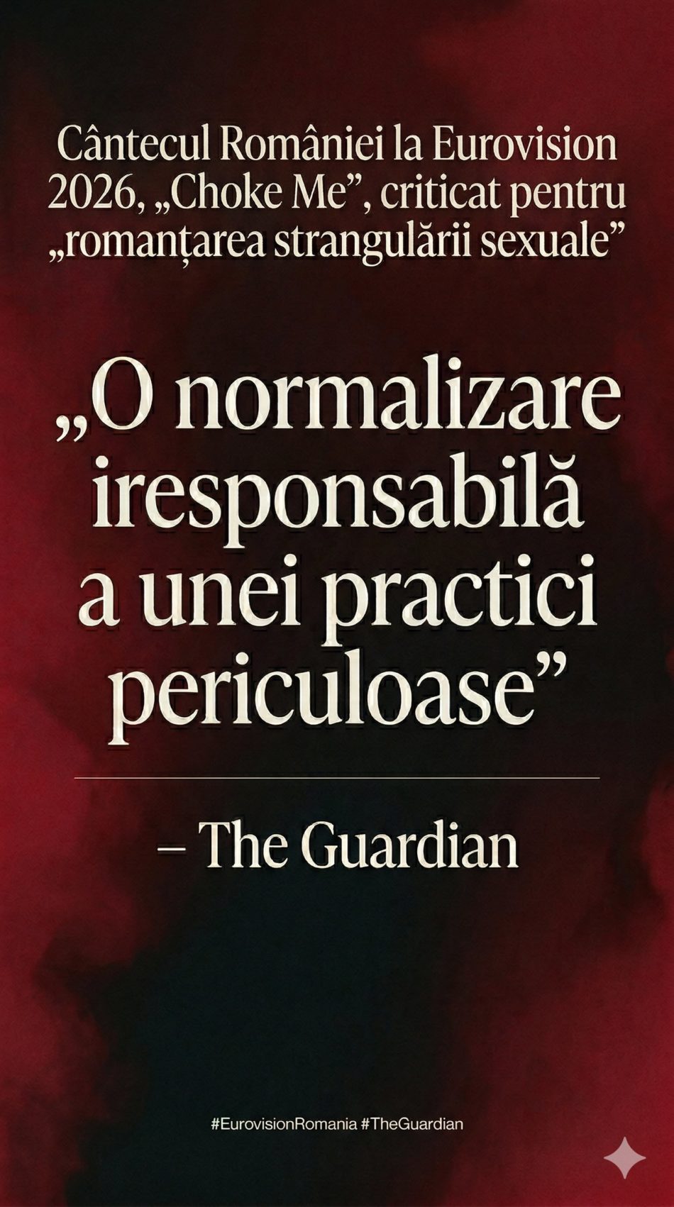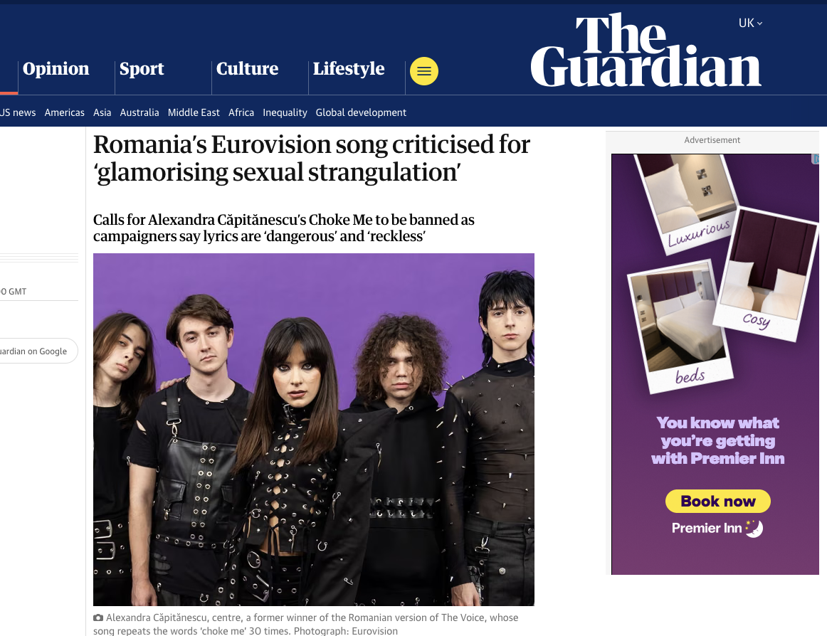 Melodia care reprezintă România anul acesta la Eurovision a ajuns în centrul unui scandal internațional, iar argumentele aduse în apărarea ei ratează complet esența problemei. Într-un articol amplu, cotidianul britanic The Guardian a criticat dur piesa „Choke Me” a Alexandrei Căpitănescu, acuzând o „normalizare iresponsabilă” a strangulării sexuale – o practică extrem de periculoasă, care poate lăsa traume pe viață.