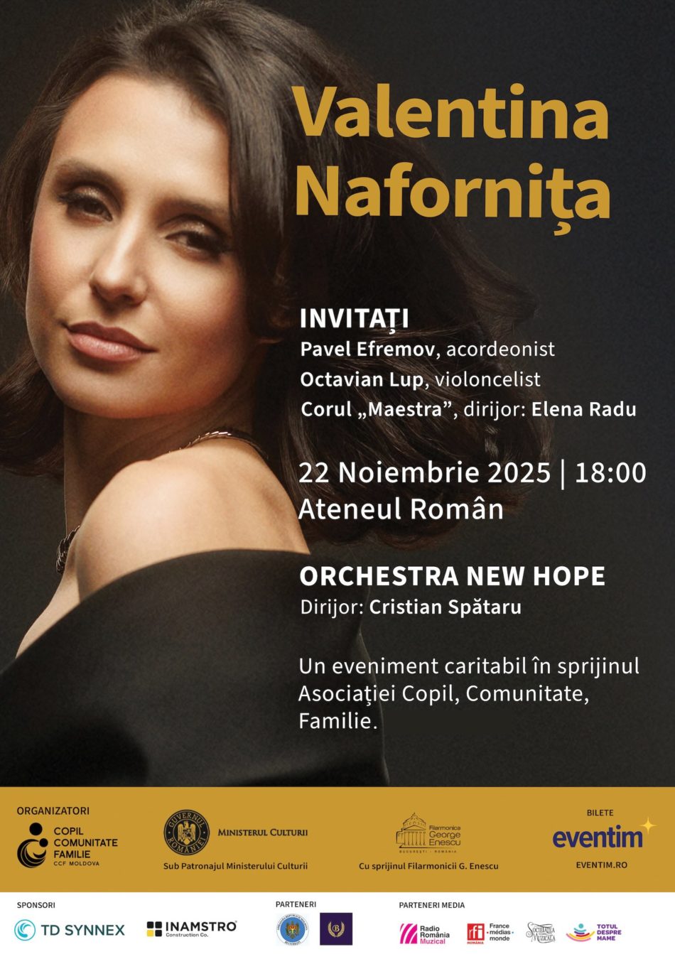 Pe 22 noiembrie 2025, Valentina Nafornița, soprana care a cucerit publicul de pe marile scene ale lumii, va fi prezentă pe scena Ateneul Român. Alături de ea se va afla Orchestra New Hope, sub bagheta dirijorului Cristian Spătaru, precum și invitați speciali: Octavian Lup (violoncel), Pavel Efremov (acordeon) și Corul de copii „Maestra”.