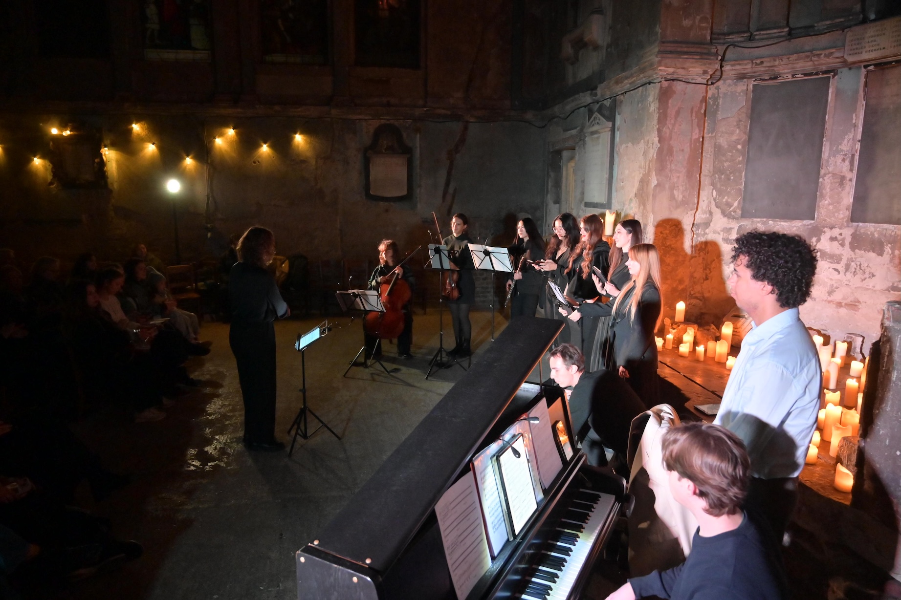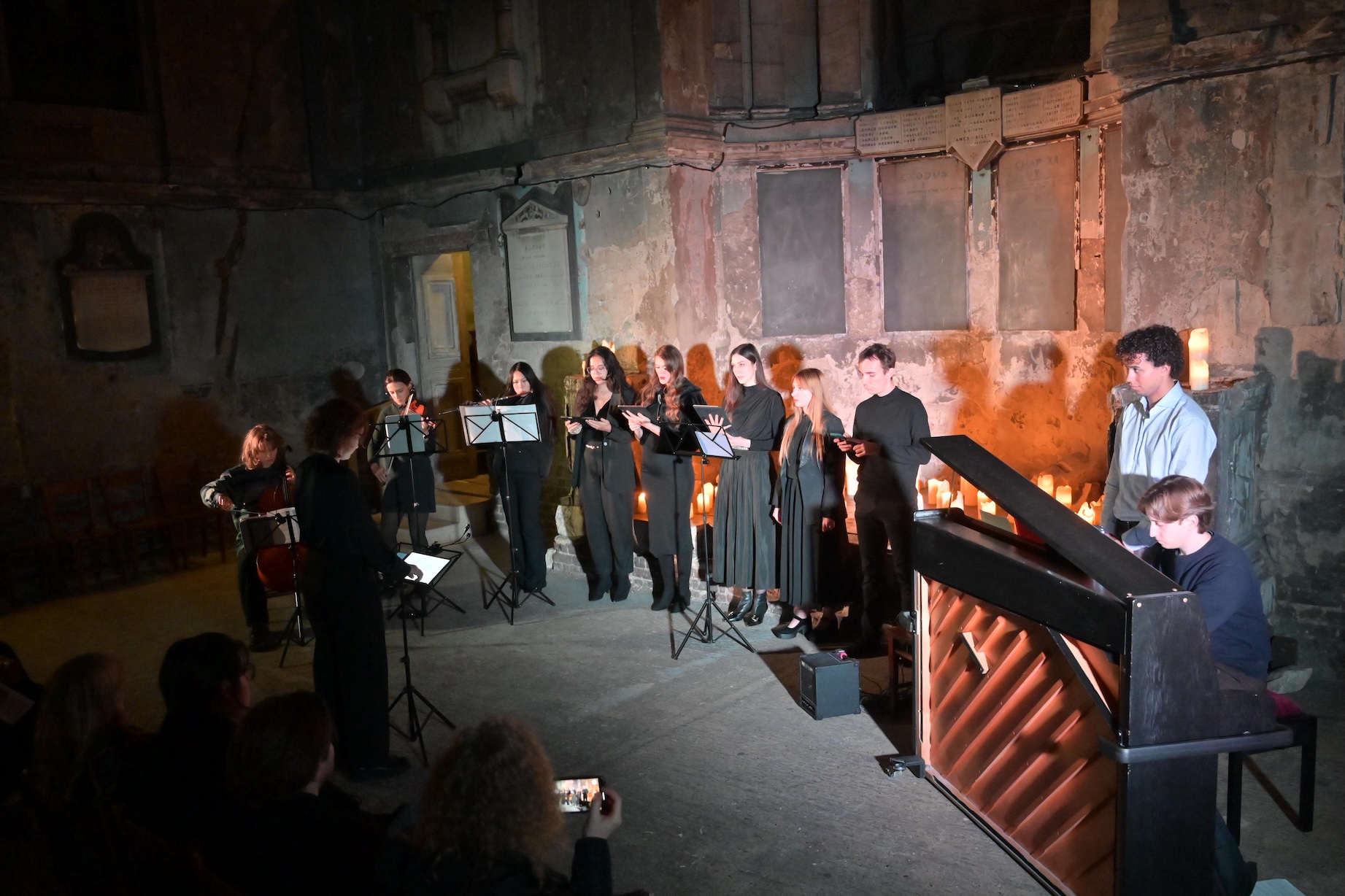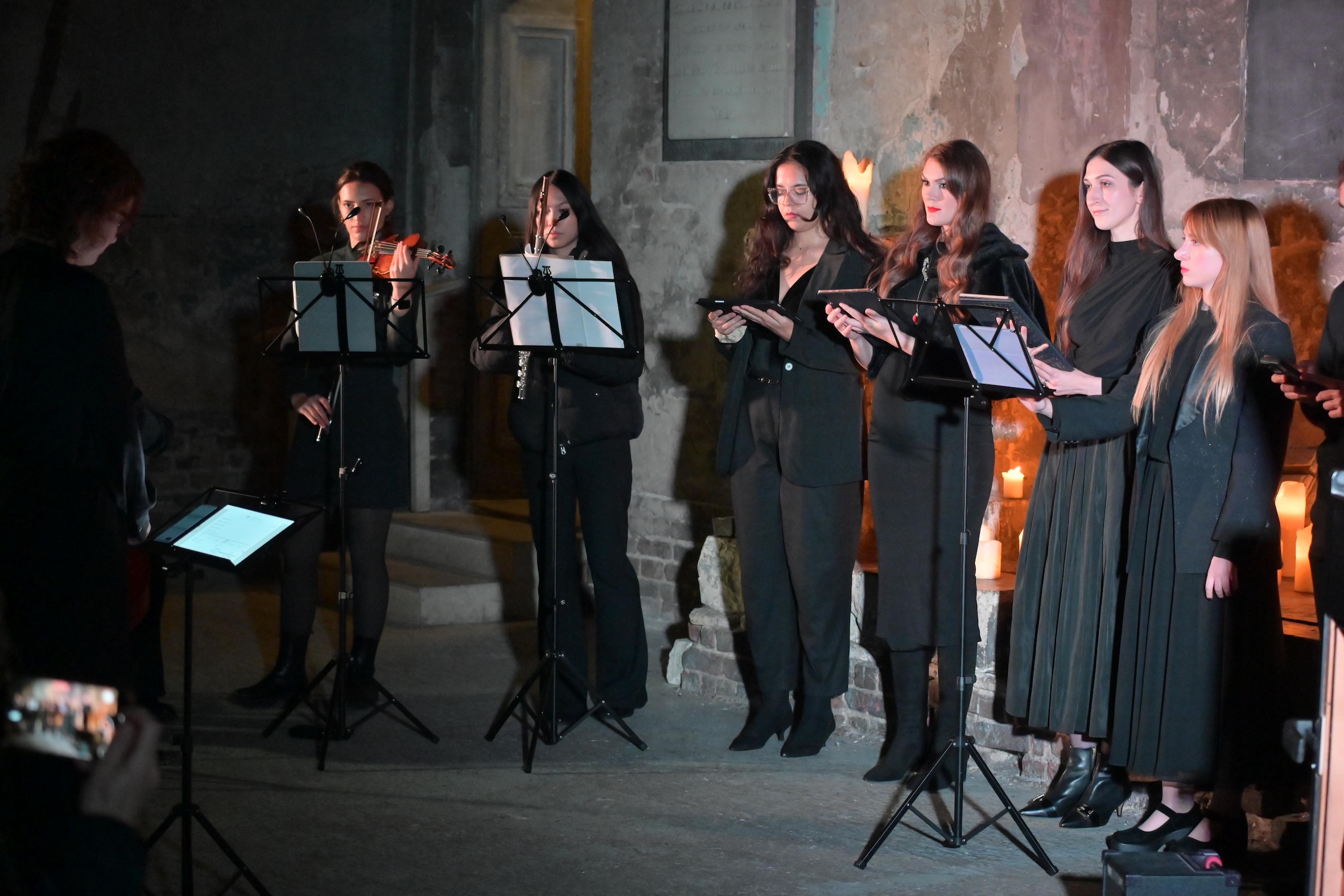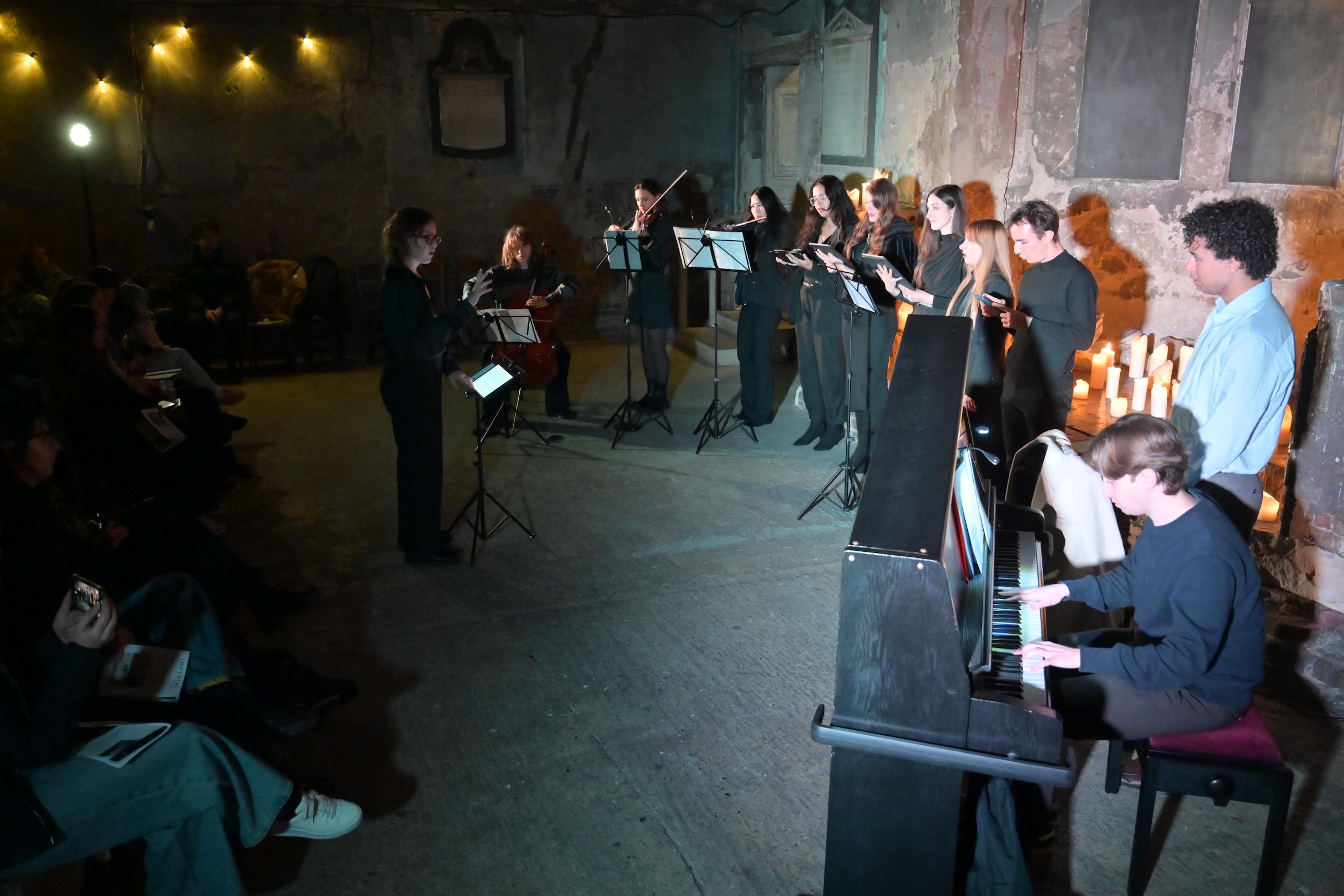 Capela însăși este un spațiu aparte care adună laolaltă istorie, moarte, iubire și viață, creând o atmosferă ce șterge granițele timpului. Între vitralii, arcade, ornamente de marmură sau piatră și plăci comemorative care și-au păstrat patina originală, tinerii muzicieni au adus câteva lumânări de ceară adevărată și harul lor luminos, alături de un program cu totul aparte, care a îmbinat compozițiile clasice semnate de Johannes Brahms, Mozart, Ralph Vaughan Williams sau Giulio Caccini cu cele ale compozitorilor contemporani nespus de tineri, David Balica, născut în 2001, și Zsolt Balint, venit pe lume în 2004. Nici instrumentele nu au fost tocmai convenționale, fiindcă, în afară de pian, violoncel, vioară, muzicienii au prezentat și folosit și un instrument abia creat, un așa-numit digital sine bell, motiv sonor și uimitor pentru care, de altfel, ansamblul, împreună cu inventatoarea clopotului digital, Anna Silver – componentă a ansamblului muzical ViDaNova – au câștigat Premiul Mercer pentru Inovație 2025 la categoria Muzică, precum și Premiul Centenar CGCA pentru Antreprenoriat, acordat unui proiect de cercetare inovator.